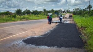O governo do Acre, por meio do Departamento de Estradas de Rodagem, Infraestrutura Hidroviária e Aeroportuária (Deracre), executa serviços de tapa-buraco no km ...