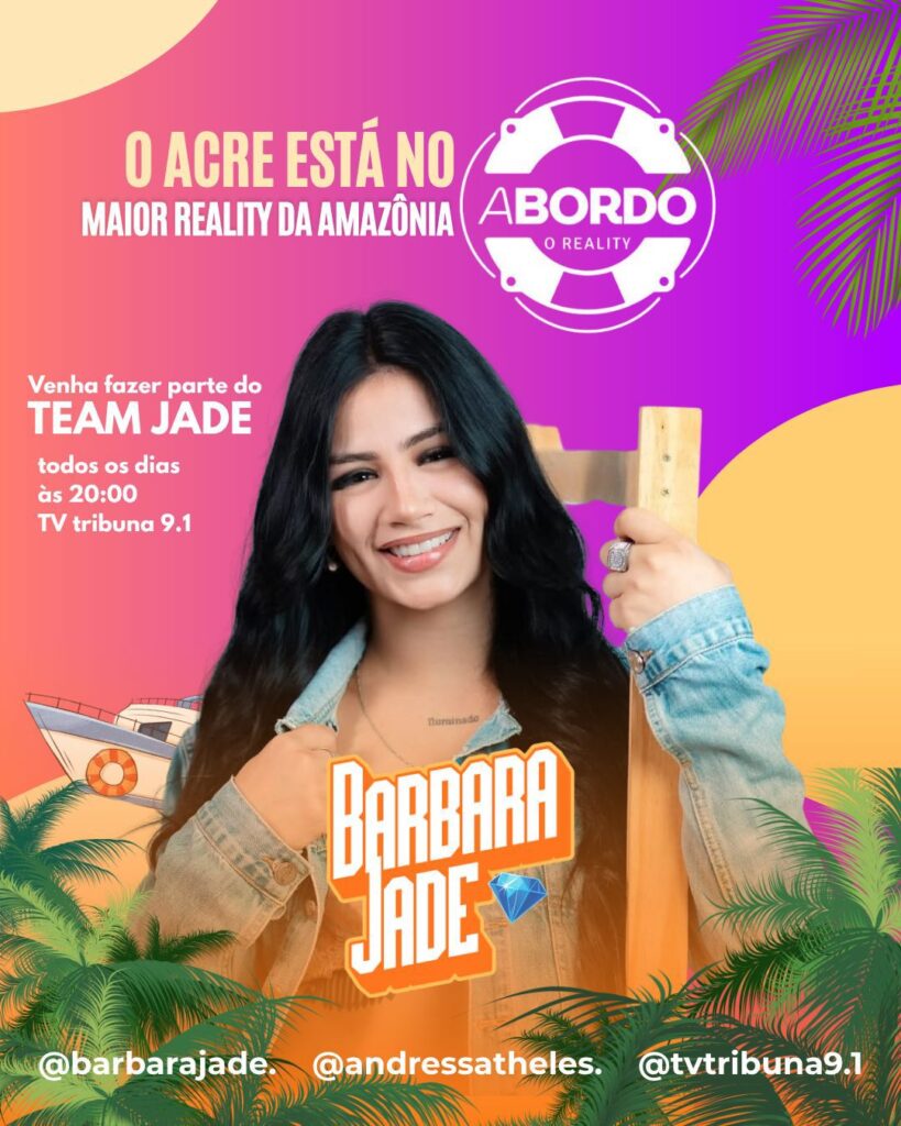 E hoje é dia de eliminação no Abordo. Mas, para alívio dos fãs, Bárbara Jade não está na berlinda. O público pode continuar acompanhando sua jornada e interagindo pelas redes sociais da TV Tribuna, da TV A Crítica e da própria competidora.