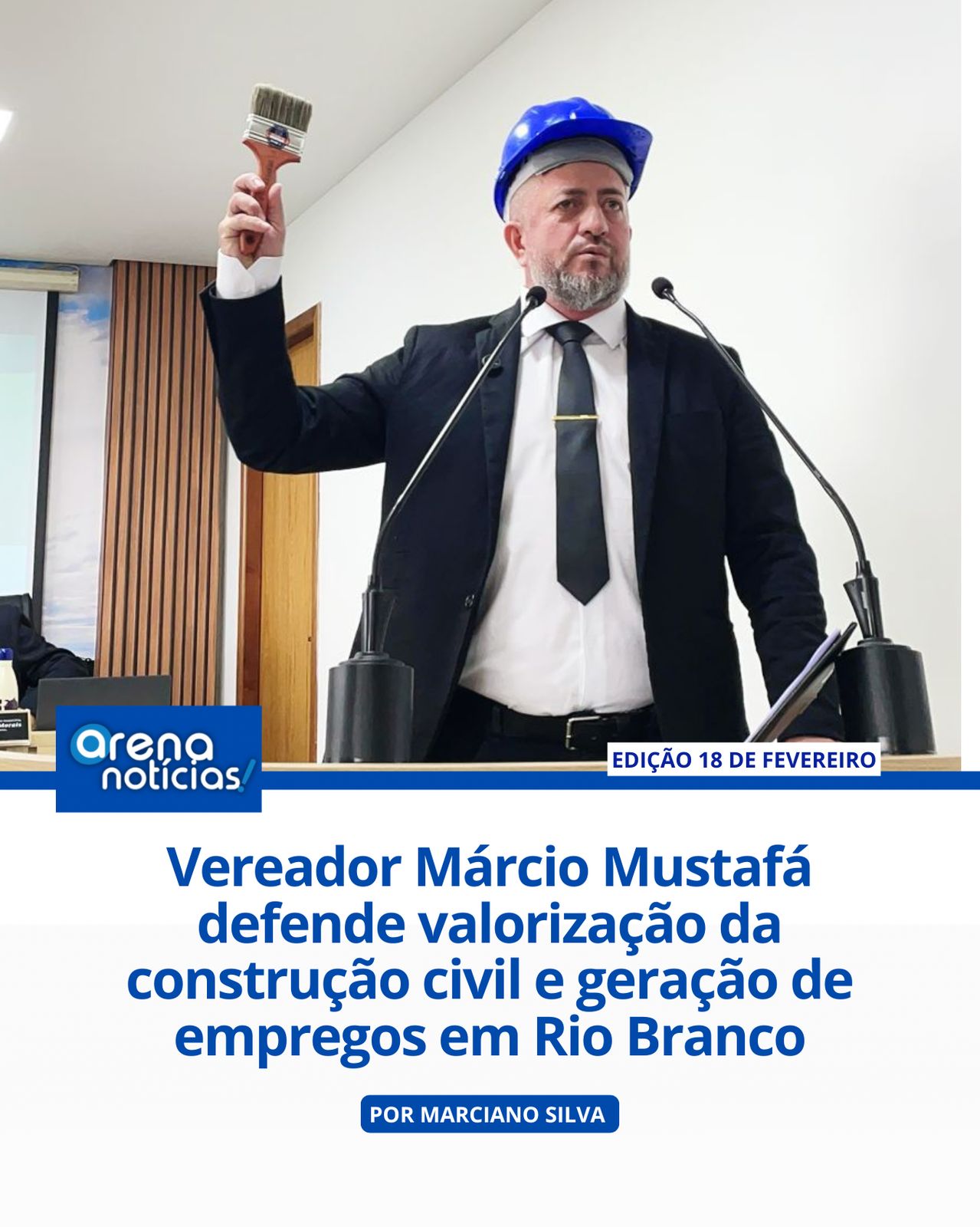 Com capacete de obra e pincel nas mãos, nesta terça-feira (18 de fevereiro), o vereador Márcio Mustafá utilizou a tribuna para destacar a importância da constru...