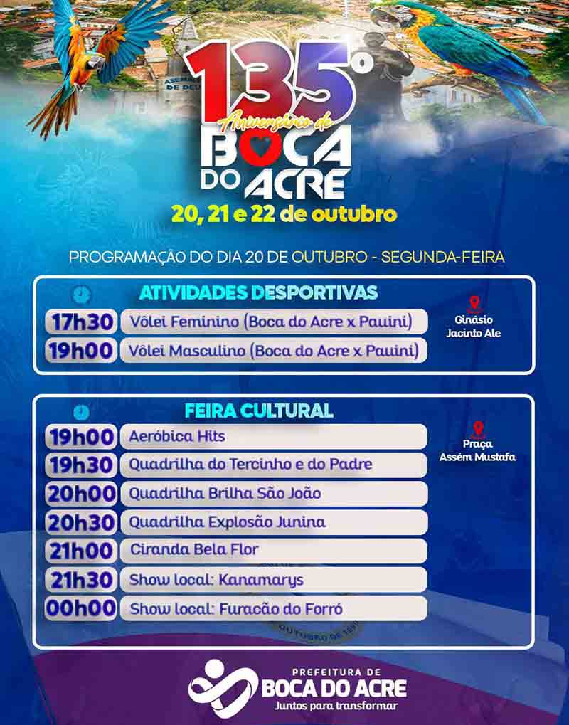 De acordo com a Prefeitura, a programação foi planejada não apenas como ato comemorativo, mas como reafirmação do compromisso com o desenvolvimento cultural, social e histórico do município. As atividades seguem até o dia 22 com manifestações artísticas, celebrações comunitárias e ações institucionais que consolidam os 135 anos de Boca do Acre como um marco de memória, identidade e projeção para o futuro.