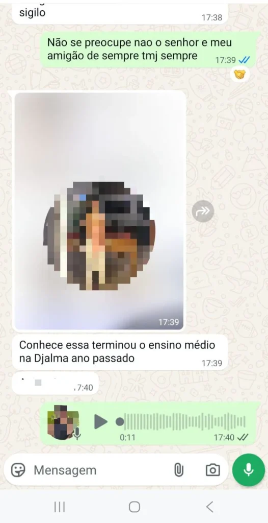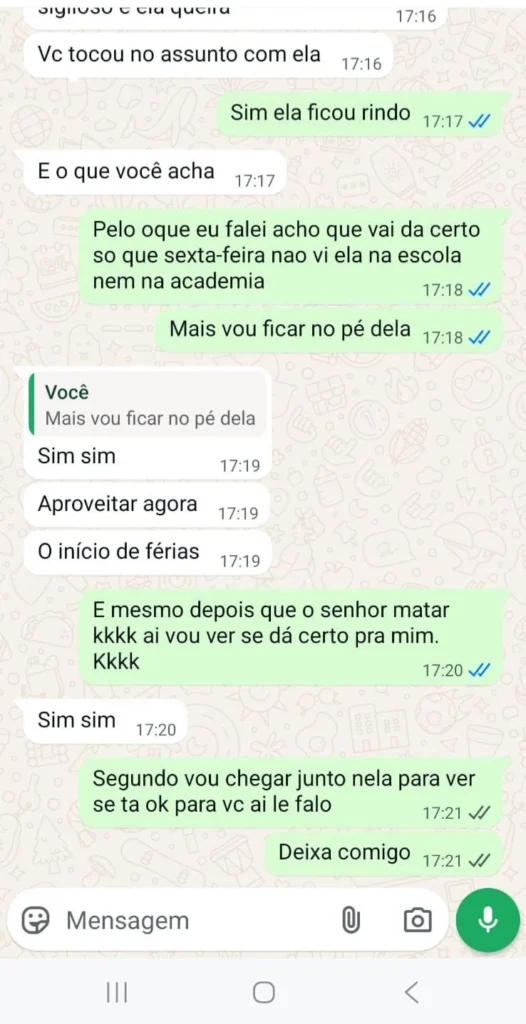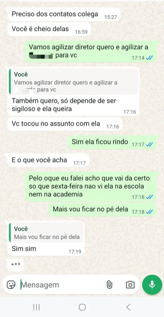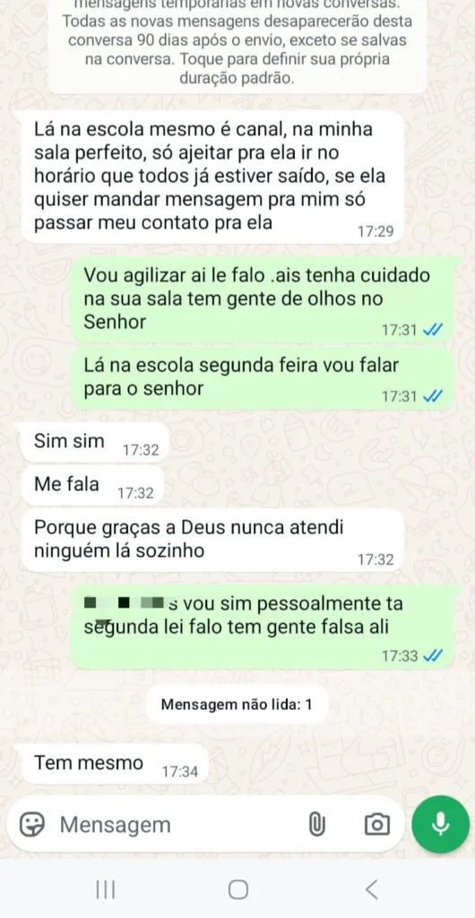 As mensagens, que circularam em aplicativos e redes sociais, teriam sido trocadas por meio do WhatsApp. No diálogo, os envolvidos conversam sobre a realização do encontro e mencionam, inclusive, a hipótese de que ele ocorresse nas dependências da própria unidade de ensino. Em um dos trechos, o professor orienta o diretor a agir com cautela, o que gerou preocupação entre pais, responsáveis e a comunidade escolar.