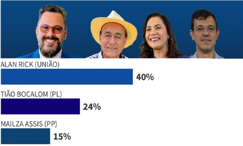No primeiro deles, Alan lidera com 40%, contra 24% do prefeito de Rio Branco, Tião Bocalom (PL). A atual vice-governadora Mailza Assis (PP) soma 15% e o médico e pré-candidato ao governo, Thor Dantas (PSB), 5%.