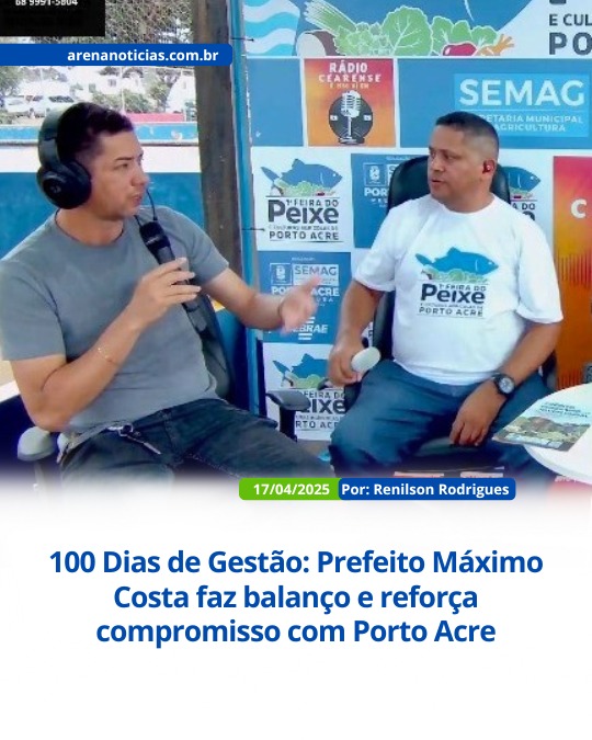 Em clima de prestação de contas e proximidade com a população, o prefeito de Porto Acre, Máximo Costa, participou de um programa especial da Rádio Cearense, durante a 1ª Feira do Peixe do município. Aproveitando a ocasião, ele fez um balanço dos primeiros 100 dias à frente da gestão municipal — e trouxe à tona avanços, aprendizados e também os desafios que marcaram esse início de mandato.