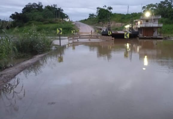 A ponte provisória instalada pelo DNIT, na altura do km 10 da BR-364, entre Sena Madureira e Manoel Urbano, amanheceu coberta pelas águas do rio Caeté nesta qui...