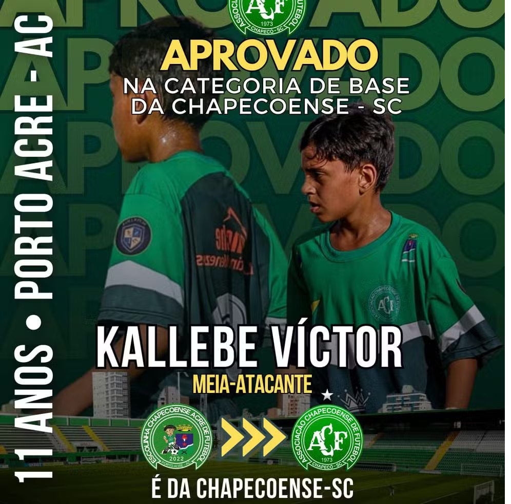O jovem meia-atacante Kallebe Victor, 11 anos, atleta da Escolinha Chapecoense, do município de Porto Acre, no interior do estado, foi aprovado em avaliação técnica da Chapecoense. O atleta participou dos testes no período entre os dias 1 e 5 de dezembro, em Chapecó (SC).