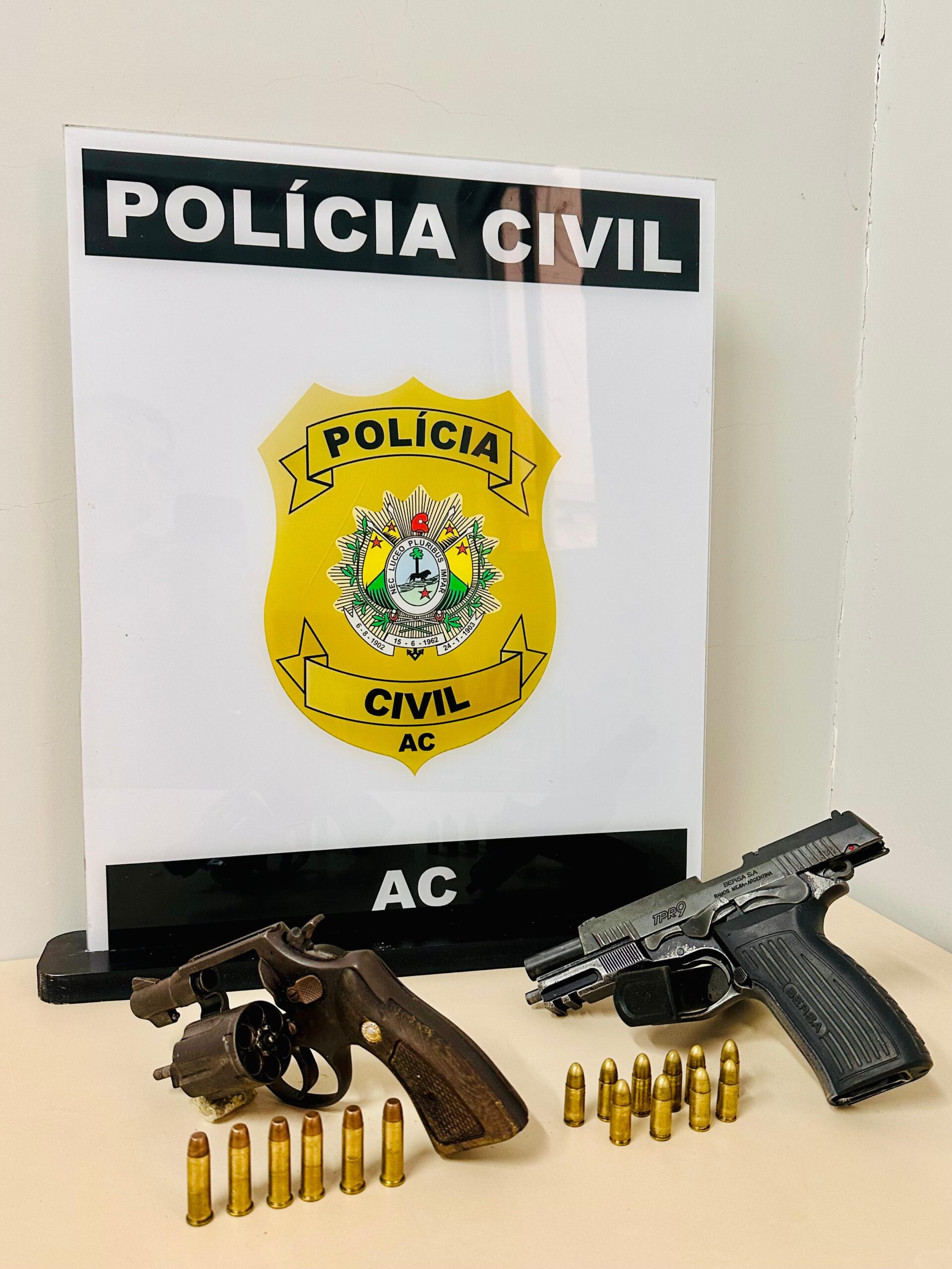 Durante o cumprimento dos mandados, os policiais civis apreenderam duas armas de fogo em poder dos investigados, um revólver calibre .38 e uma pistola calibre 9mm, ambas municiadas, configurando também o flagrante delito por posse ilegal de arma de fogo de uso restrito. As prisões ocorreram em locais distintos do município de Cruzeiro do Sul, sem resistência.