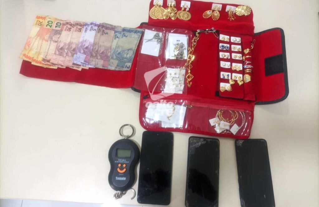 Durante a ação, estavam no imóvel o marido da suspeita e duas crianças pequenas, que foram entregues ao pai. Os militares perceberam movimentação suspeita dentro da casa e, com autorização de Giovanni, realizaram uma busca, encontrando três celulares (dois Samsung e um Motorola), uma balança de precisão, várias semi-joias sem nota fiscal, uma faca tipo punhal e R$ 124 em espécie.