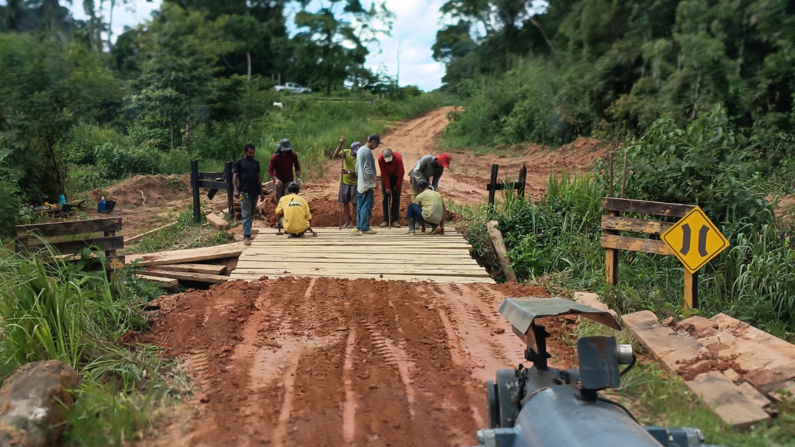 Regional AC 90 km 38 Ramal Dona Creuza, construção de ponte em conjunto com a comunidade (data de execução do serviço: 22 de janeiro de 2026). (Foto: Secom)