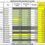 Já nas bacias do Tarauacá e Envira, o cenário é de queda significativa. Em Tarauacá o nível caiu 65 cm, situando-se em 7,47 m. O Rio Envira, em Feijó, registrou vazante de 23 cm, marcando em 4,82 m.