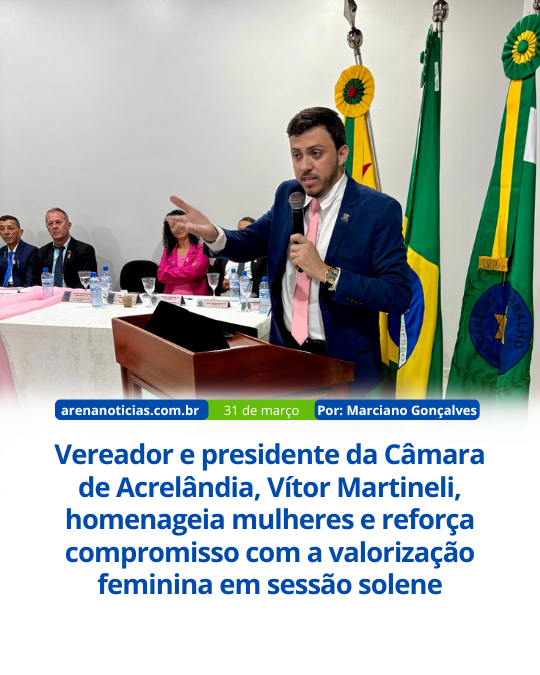Na noite desta segunda-feira (31), em Acrelândia, a Câmara Municipal realizou uma sessão solene em homenagem às mulheres, onde o presidente Vítor Martineli fez discursos marcantes e entregou títulos de reconhecimento. Durante sua fala, ele destacou o papel essencial das mulheres na sociedade, homenageou sua avó e a secretária municipal de Saúde, Fernanda Menezes, além de reforçar seu compromisso com políticas públicas voltadas à igualdade e ao fortalecimento feminino.